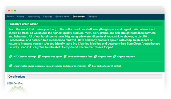 TiCATi är engagerad i att stödja gröna hotellledare som strävar efter gröna metoder inom hotellbranschen. Vi har tillgång till tusentals hotell som försöker göra världen till en grönare och bättre plats. Oavsett om det är genom att erbjuda lokala, veganska och ekologiska livsmedel, använder man låga VOC-ämnen (flyktiga organiska föreningar) för att förbättra sin inomhusluftkvalitet, städning med naturliga produkter för att skydda växterna såväl som deras gäster med förnybar energi, återvinning, minskning konsumtion av naturresurser, främjande av rena transportalternativ eller stöd till lokalsamhället och djurskydd.